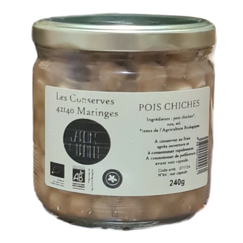 Ces pois chiches bio sont cuits et conservés dans un bocal de 240 g, avec uniquement de l’eau et du sel.