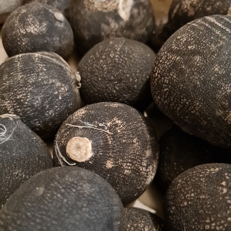 Le radis noir se distingue par sa peau sombre et sa chair blanche, ferme et croquante. En bouche, il offre une saveur vive et légèrement piquante, qui s’adoucit à la dégustation ou à la cuisson.