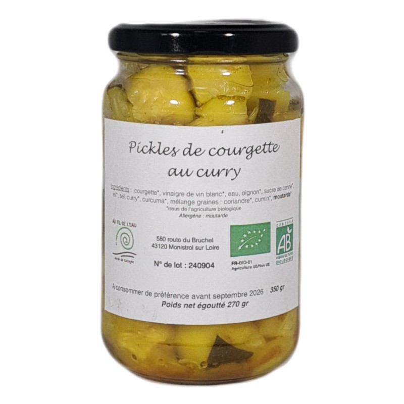 Ces pickles de courgette bio sont préparés artisanalement avec des courgettes fraîches, du vinaigre de vin blanc, un soupçon de sucre de canne et un savant mélange d’épices : curry, curcuma, coriandre, cumin et moutarde.